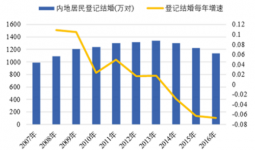 此外市场一直是市场的重要组成部分。根据国家统计局资料显示,自2013年以来中国登记结婚数已经连续四年负增长,但这种负增长并不是长期利空,而是短期结婚意愿回调下铸就的“黄金坑”。因为我国目前总人口增长趋势不变,单身未婚男女比例长期平稳,未婚主要是由于个人意愿而非客观因素。