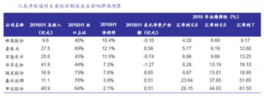 以人民币兑美元贬值测算主要纺织制造业业绩弹性,弹性从大到小依次是申达股份、嘉欣丝绸、联发股份、华孚色纺、百隆东方、鲁泰a、新澳股份。