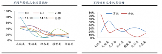 不同年龄段以及不同性别的儿童对玩具有不同的偏好。根据皮亚杰关于儿童认知理论的研究表明,不同年龄段和不同性别的儿童所处的认知阶段不尽相同,对于玩具的喜好也会受到影响。就性别差异而言,70%的女生喜欢毛绒玩具,只有不到20%的男生喜欢毛绒玩具。最受男生喜欢的玩具类型是电动,变形玩具和模型玩具。年龄是影响儿童玩具喜好的另一重要因素,总体来说儿童最受儿童喜欢的玩具依次为:毛绒玩具、遥控玩具、有声玩具、积木玩具、模型类玩具等。