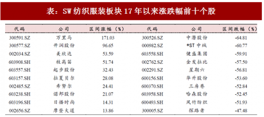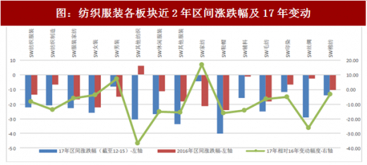 17年以来,纺织制造板块下跌20.71%,服装家纺板块下跌22.71%;3级子板块中,板块跌幅最小(-4.39%),鞋帽板块跌幅最大(-40.17%)。
