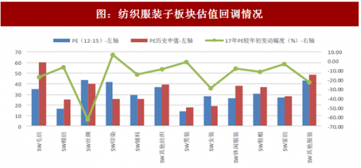 纺织服装行业pe(ttm_整体法,剔除负值)较年初回调17.70%,较15年高峰位置回调45.38%;纺织服装行业pe(ttm_中值,剔除负值)较年初回调38.52%,较15年高峰位置回调59.30%。估值回调幅度较大,反映板块估值与业绩增速渐趋匹配,部分估值持续低估及回调到位细分板块及标的配置机会增加。