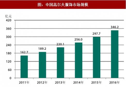 根据《朝向白皮书》以及国家统计局的数据测算,2011年我国高尔夫服饰市场规模为162.7亿元,按照2006-2011年中国服装市场规模16.3%的年均增长率估算,2016年我国高尔夫服饰市场规模预计将达到346.2亿元。