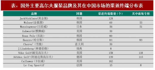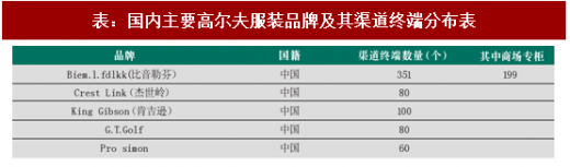 目前在国内市场上的高尔夫服饰品牌数量不少,但无论是国外品牌,还是国内品牌,其终端渠道的量普遍不多,市场覆盖面有限,所产生的市场销售额也都不大。