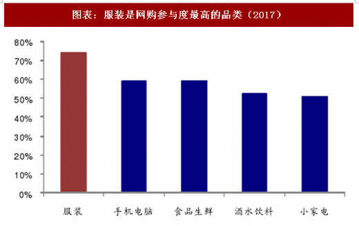据 euromonitor 统计,2017 年服装行业零售额达到 1.92 万亿元,同比增长 6.0%,2012-2017 年 cagr 为 6.2%,传统行业在出现明显变革前,品牌商争夺的是存量市场中的需求再分配。电商发展初期,服装品类是最早实现线上渗透,并快速增长的品类。在 2010 年以前的市场环境下,由于进入门槛不高,款式生命周期短,尤其是低价位产品的品牌忠诚度低,服装成为电商卖家的主要选择品类。直到 2017 年服装仍然是参与度最高的品类,根据艾瑞咨询电商消费者中超过 70%购买过服装类产品,高于 3c 品的手机电脑品类,以及快速崛起的小家电品类。