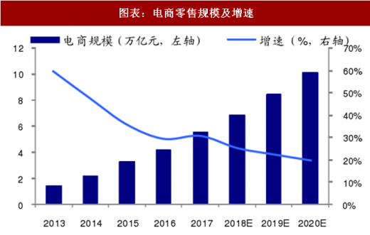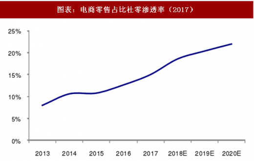 中国电商行业发展早、速度快,经过多年的发展成为社会零售消费中重要的渠道之一。国家统计局公布的实物商品网上零售额显示,国内电商零售规模从 2013 年的 1.4 万亿元,增长至 2017 年的 5.5 万亿元,当年同比增速为 31%,2013-2017 年 cagr 为 41%。同期,电商的渗透率不断提升,占比社会零售的占比从 2013 年的 8%提升至 2017 年的 15%,艾瑞咨询预测到 2020 年电商零售规模将达到 10.1 万亿元,占比社零总额将达到 22%。