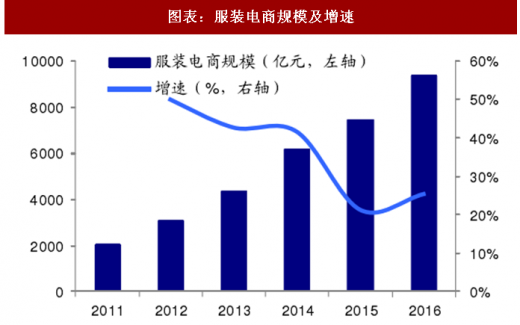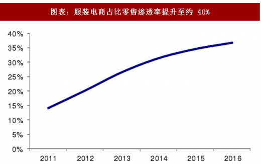 服装品类有区别于其他品类的独特性,相比 3c 个性化程度高,简单的变种就可形成新的设计,在产品质量差异化低的时期,产品可替代性强;相比食品类早期消费者对安全性有所顾虑,服装尤其是成人服装产品比较少有安全性的潜在危险;相比高价商品,服装产品单价低,更容易形成交易。据中国产业信息网统计,2011 年国内服装电商市场规模为2035亿元,2016年市场规模增长至9343亿元,当年同比增速为25%,2011-2016 年 cagr 为 36%。服装电商的渗透率也从 2011 年的 14%提升至 2016 年的37%。