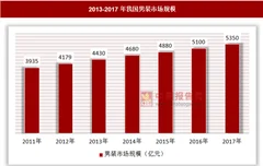 随着我国经济水平的不断发展,人们的生活水平提高,我国男装市场在不断提高。但是由于行业发展逐渐成熟,男装市场规模增速处于较为平缓的增速,稳定增长但增速变缓。男装行业市场规模在 2017 年达到约5346 亿元,预计 2020 年将达到 5991 亿元的规模,市场规模增速在 2011 年后不断下降,自2014 年稳定在4%左右,主要由于市场饱和度的上升。