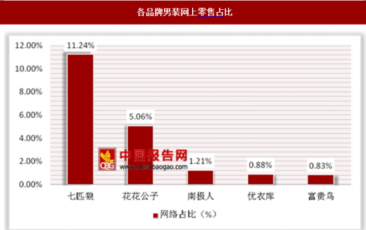 受到网络零售的影响,我国男装网上零售规模也在不断增加,从男装网络零售情况来看,2018年7月男装行业网络零售前五品牌分别是:七匹狼、花花公子、南极人、优衣库以及富贵鸟。其中,七匹狼品牌男装网络零售额占比为11.24%,位列第一,遥遥领先于其他品牌;其次,花花公子占5.06%,排名第二;南极人位列第三,占1.21%,相对于女装市场,我国男装网上市场仍有较大的提升空间。