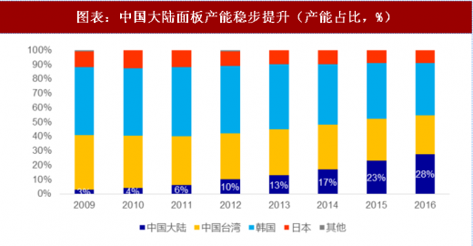 中国面板产能取得突破,全球占比稳步提升。大陆面板产业经过二十多年的追赶,产能占比从 2009 年的 3%上升至 2016 的 28%,已经逐渐成为世界上主要的面板生产国。根据工信部资料显示,2017 年上半年国产面板出货面积为 3182 万平方米,全球占比达 33%,中国大陆显示面板凭借多条高世代线建设,产能将有效释放,有望在 2019 年位居全球首位。