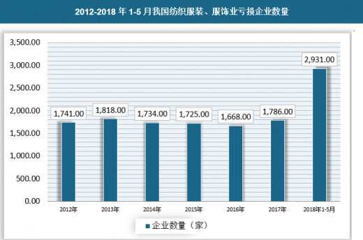 截至2018年5月,我国共有纺织服装、服饰业企业14413家,亏损1786家,2017年我国纺织服装、服饰业企业15825家,亏损企业2931家,相比2017年,今年1-5月份企业数量减少1412家,亏损面达到12.39%。