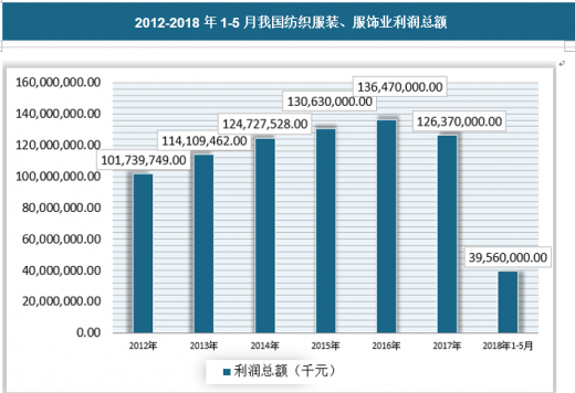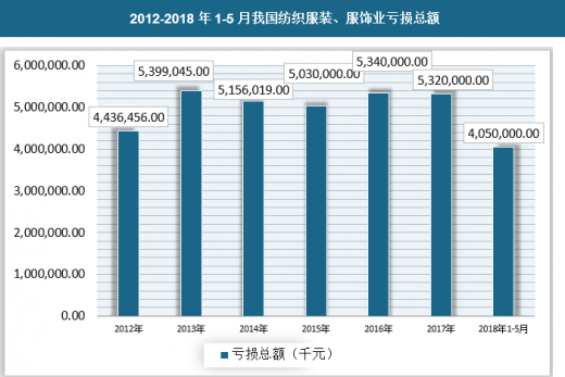 截至2018年5月,我国纺织服装、服饰业企业利润总额为39,560,000.00千元,亏损总额4,050,000.00千元,亏损深度为10.24%。