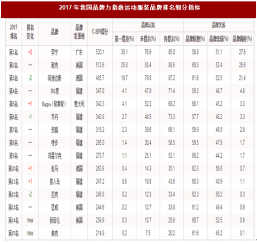 我国是世界上最大的纺织服装生产国、消费国和出口国。根据数据显示,2017年在限额以上服装行业批发和零售额合计为10356.4亿元,其产量为287.81亿件。而在市场份额方面,据中国品牌力指数研究院数据显示,2017年我国运动服装品牌力指数得分排名第一的是李宁达到520.1,比上年提升了2个名次。