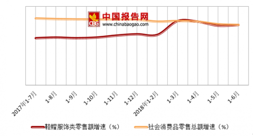 2017-2018年鞋帽服饰类零售额增速与社会消费品零售总额增速比较