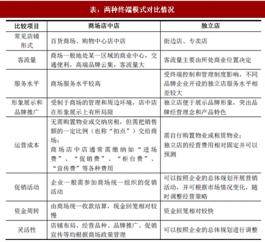 商场店中店主要是指在百货商场、超市、购物广场、综合市场等各类大、中型零售商场中设立的专柜。独立店大部分位于城市商圈或知名商业步行街,通过独特的店铺形象设计招徕顾客,两种终端模式对比如下: