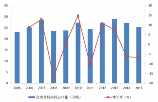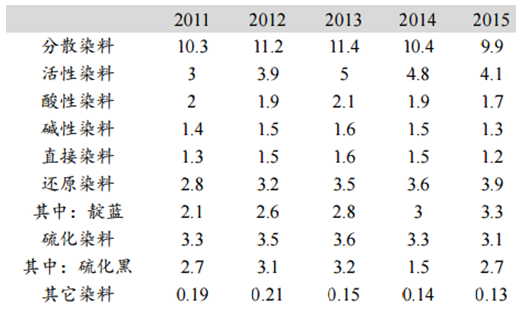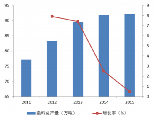 据中国染料工业协会统计,在“十二五”期间,我国染料工业总产值年均增长率为8%,产量年均增长4.5%。2015年,染料总产量达92.2万吨。