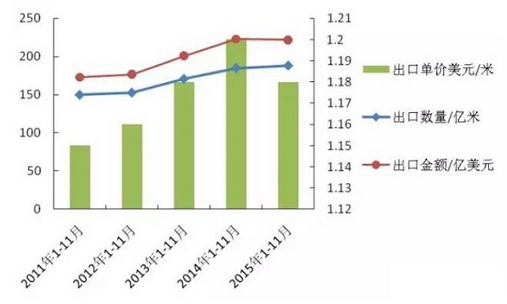 2015年1-11月份,印染八大类产品进出口总额242.36亿美元,同比减少1.72%,增速较2014年同期回落10.62个百分点;出口数量188.01亿米,同比增长1.68%,增速回落6.66个百分点;出口金额221.47亿美元,同比减少0.56%,增速回落11.56个百分点;出口平均单价1.18美元/米,同比减少2.20%,增速较2014年同期回落4.65个百分点,表明我国印染布直接出口增速回落,价格下跌。