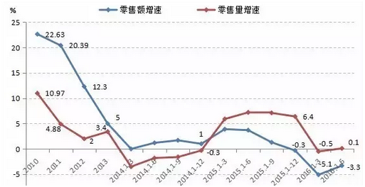 根据中华全国商业信息中心的统计,2016年上半年全国百家重点大型零售企业服装类商品零售额同比下降3.3%,增速较上年同期下降7.0个百分点;各类服装零售量同比增长0.1%,增速较上年同期低7.1个百分点。