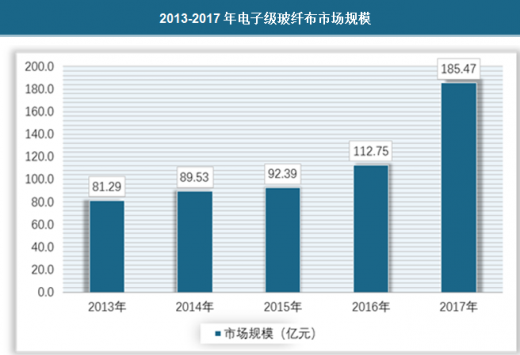 2015年前来我国电子级玻纤布的市场规模保持稳定增长,增速保持在10%左右,而2016年我国电子级玻纤布的市场规模快速增长,达到112.75亿元,增速为22%,主要原因在于电子布的价格上扬,需求端开始放量。2017年我国电子布市场规模增速进一步加快,达到64.5%,原因是电子布下游需求旺盛,导致产业供不应求,推动电子布价格上涨。2017年我国电子布市场规模达到185.47亿元。具体如下: