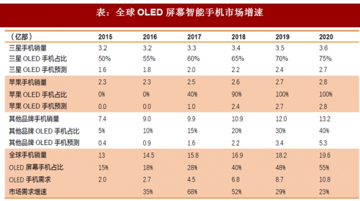 oled 需求快速增长,在智能领域渗透率快速提升。oled 屏凭借其轻薄、低延迟、高对比度、柔性等特点,广泛应用在智能手机、电视面板、平板电脑、笔记本电脑、可穿戴设备(智能手表)、 设备、车载中控面板等新兴应用领域。其中智能手机消耗全球一半以上oled 产能,弹性最大。目前,三星以galaxy 系列为代表的中高端系列手机基本已采用oled 显示屏;苹果iphone x 采用rigid oled,2018 年后或大面积采用flexible oled;国产手机oled 屏幕占比提升,中高端国产机型,如vivo xplay6 采用flexible oled 突出产品特色。oled 在智能手机领域渗透率快速提升,从三星到苹果再到国产机,oled 是确定性大趋势。2016-2020 年,oled 需求复合增速有望达到38.7%。
