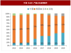 中国oled 强势崛起。2015-2020 年我国oled 产能复合增速在99%,远高于全球47%的复合增速。其中,国内企业京东方、天马、华星光电、维信诺和辉加速扩产,到2020 年国产oled 屏产能占比或达40%。预计到2020 年,全球oled 显示屏市场将由韩国三星一家独大,演变成韩国和中国双极态势。