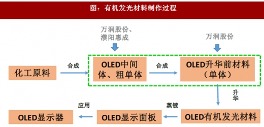 从有机发光材料的制作过程来看,首先由材料厂商将化工原料合成oled 中间体和单体粗品,再进一步将中间体或单体粗品合成为升华前材料(单体),其次,由终端材料厂商对升华前材料进行升华处理,最后,形成oled 终端材料(有机发光材料),用于oled 现实面板的生产。国内企业目前处于制作过程的前两个环节,即中间体、单体粗品的生产和升华前材料的合成。