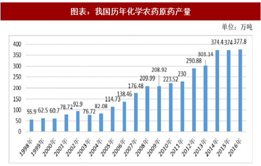 我国农药行业起步较晚,经过多年的发展,已形成了包括科研开发、原药生产、制剂加工、原材料及中间体配套等较为完整的农药工业体系。随着农村经济的发展,我国农药工业也得到了迅猛发展,2015 年我国化学农药原药年产量已经突破 370 万吨。根据国家统计局统计,2016 年我国化学农药原药产量已到达 377.8 万吨,目前我国已成为全球第一大农药生产国,产品质量稳步提高,品种不断增加,为优质高效农业提供了强有力支持。
