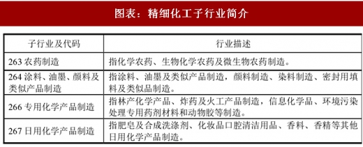 按照国民经济分类标准,精细化工分为农药制造,涂料、油墨、颜料及类似产品制造,专用化学产品制造和日用化学产品制造等 4 个子行业。