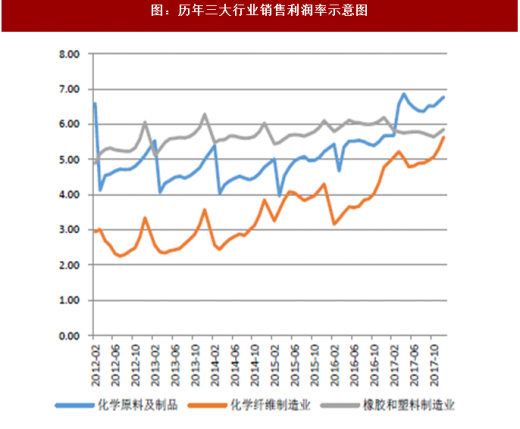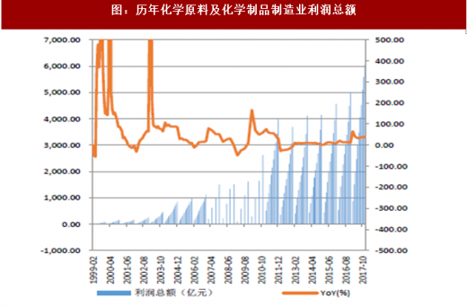 根据数据显示,及化学制品制造业营业收入2017年全年都维持了10%以上的高增速,但是从增幅来看呈现了逐步下降的状态,主要原因是16年营收增速是前低后高,因此,导致基数逐月上升。17年累计利润总额增速也均维持了超过30%的优异表现,但我们认为业绩增速高点或将过去,高弹性红利将难以为继,未来景气周期延续将主要受原材料价格(、气、煤等)、环保督查、产业升级等共同影响。