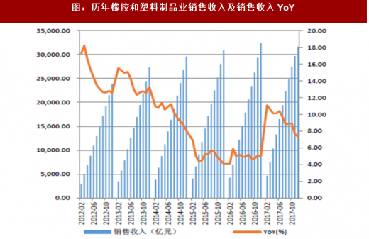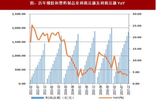 据数据显示,橡胶和塑料制品业营业收入增速和利润总额增速趋势都是前高后低,但营收增速要好于16年,利润总额增速则出现了滑坡,其主要因素是原材料价格波动、行业供给侧改革尚在进行当中及下游需求稳定,价格传导不畅,我们预计行业未来复苏概率较大,但需要时间等待。