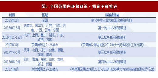 2015年开始实施的《中华人民共和国环境保护法》,2016年至2017年,合计四批次中央环保督察组在全国范围内巡查,以及京津冀以及周边地区“2 26”城市大气污染治理均体现了国家治理环境的力度与决心。