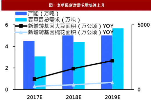 预计麦草畏2019年将供不应求。根据测算,2019年新增麦草畏需求量将达到3.7万吨,总需求将超过产能6千吨。此外,复合转基因作物拉涨麦草畏需求。2016年复合性状转基因种植面积已达到2589万公顷,即将超越单一抗除草剂。