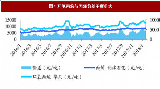 需求旺季来临,价格逐步上行:春节过后随着环氧丙烷下游聚醚多元醇、丙二醇工厂逐步复产,需求旺季逐步来临。当前华东地区环氧丙烷12750元/吨,较2017年均价10912元/吨上行17%,价差进一步扩大。