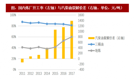 图:国内炼厂开工率(左轴)与汽柴油裂解价差(右轴,单位:元/吨)