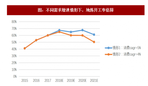 1)情形一:国内石油需求cagr=5%,对应地炼开工率基本平稳在60%以上。意味着规模相对较大、拥有原油进口配额的地炼基本满负荷。该情形下,预计炼油盈利可以保持2017年的高位。