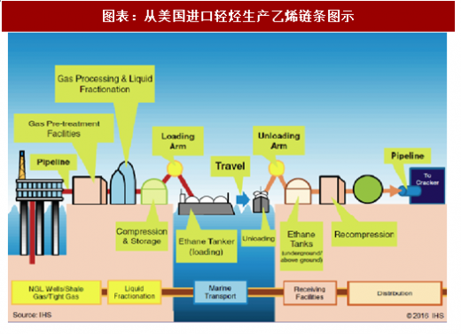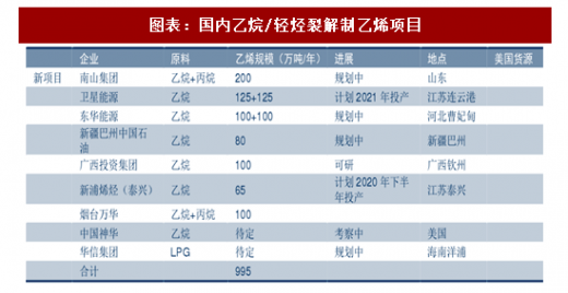 2017 年开始,中国企业开始瞄准乙烷制乙烯市场,陆续有多家企业宣布将引进美国低价的轻烃原料生产乙烯。截至 2017 年底,我国有 6 家企业开始规划乙烷或乙烷/丙烷混合脱氢制乙烯项目,合计产能超过 900 万吨。