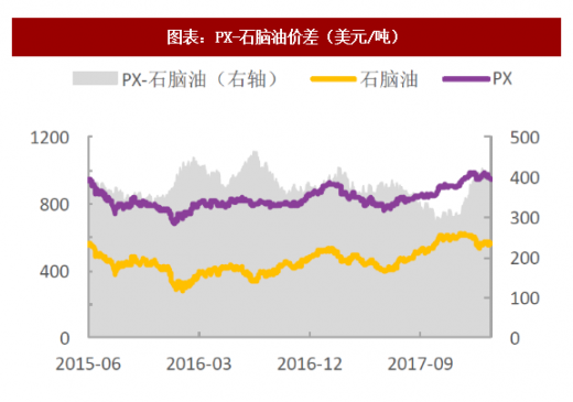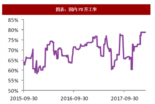 2017年px价格年初高位震荡,年中走低,11月份以后,持续上行。2017年平均价为853美元/吨。去年下半年石脑油价格随国际油价持续上涨,px-石脑油价差逐步缩小至300美元/吨以下,今年年初油价稳定后小幅回落,同时px价格也保持上行,目前px-石脑油价差上升至400美元/吨左右。根据wind统计的国内px装置开工率,2017年11月份以后开始从61%逐步提高到79%。