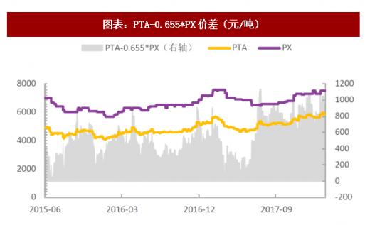 前几年供应过剩,价格较低,行业呈现亏损态势。2017年,随着下游聚酯复产,pta供需结构改善,尤其下半年现货持续紧张,价格稳步上涨,年均价为5160元/吨,行业逐渐扭亏为盈。pta价格上涨一方面受益于成本端支撑良好,另一方面受益于下游消费的持续增长。2017年下半年pta整体供需格局偏紧,pta价格涨幅大于px价格涨幅,pta-0.655px价差大幅上升至800元/吨以上,最高超过1000元/吨。