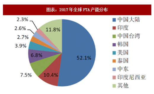 随着近几年我国pta产能的高速增长,我国pta产能在全球已占据主导地位,2017年中国大陆pta产能占全球的52.1%,其他产能较高的国家或地区如印度、中国台湾、韩国的产能则分别占全球pta产能的10.4%、7.5%、6.8%。