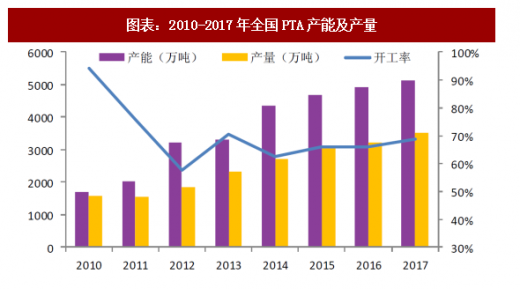 2010-2014年,我国pta产能高速增长,从2010年的1690万吨增长至2014年的4342万吨,年均增速26.6%。而产量的增长未能跟上产能的增长,过度的产能投放致使年均开工率迅速下滑,从2010年的94%降至2014年的63%。2015年到2017年,pta产能增速降至个位数,年均开工率也缓慢回升至2017年的69%,产量为3526.26万吨。