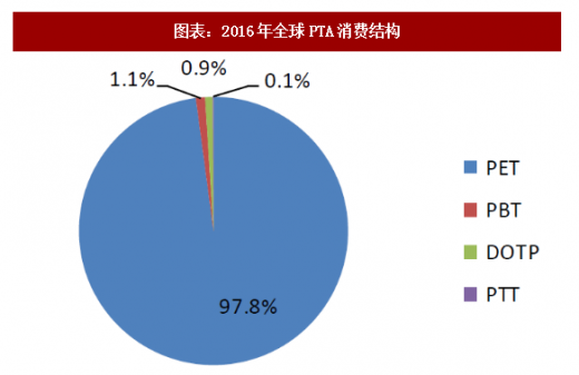 全球绝大多数的pta用于生产聚酯,2016年有97.8%的pta用于生产pet。pta还可用作pbt、ptt的原料,近两年也部分替代了其他二元酸,如通过配方改变生产对苯型不饱和树脂,生产dotp增塑剂等,但总的量还是比较小。2016年pbt、dotp、ptt对pta的需求比例分别为1.1%、0.9%、0.1%。ptt和pbt等产品由于工业化起步较晚,未来几年pta需求增长的主要动力预计仍将来自聚酯。