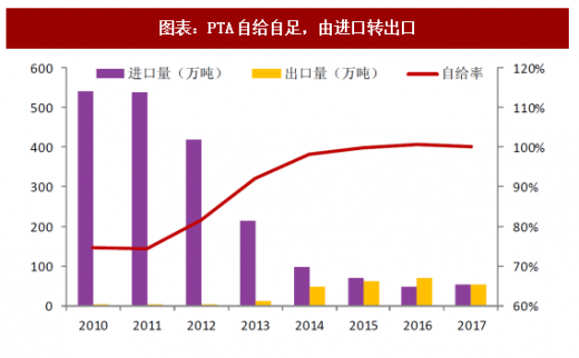 由于2010年到2014年间pta产能的快速投放,我国pta自给率快速提升,到2015年已经达到100%左右。2010年pta进口量为540万吨,到了2017年已经降至53万吨,我国开始从pta需求国变为自给自足,逐步增加出口,2017年pta出口量为52万吨,与进口量非常接近。