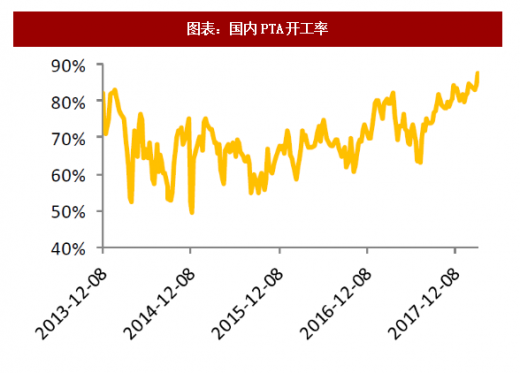 根据wind统计的国内pta开工率,从2017年下半年的64%逐步回升至近期的87%。2014年pta产能过剩时期,国内pta库存达到10天以上,近几年产能增速放缓,库存天数下降,目前为1-2天。