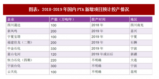 2018年国内新增pta产能不多,主要有四川晟达100万吨的产能,以及桐昆石化二期新建的220万吨产能在2018年将全面投产。2019年预计新增830万吨产能。