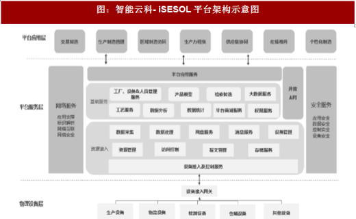 智能云科是互联网云制造服务平台企业,以智能数控设备为基础,高端工业服务为途径,整合广泛社会资源,打造isesol 平台。平台共分为三个层级,分别为业务应用层、平台服务层及物理系统层。isesol工业云平台主要包括五项功能:一是设备资源接入、基础服务、应用服务以及对外开放api;二是通过云端agent 服务进行设备接入验证以及构建数据传输通道,提供数据采集、数据存储以及数据分析等服务;三是提供工业生产要素的建模及分析、工业大数据分析、工艺分析等服务;四是提供isesol 上层业务系统数据交互服务;五是通过开放api,实现外部系统接入以及对外数据支持服务。通过与智能装配等相关企业合作,isesol 平台已经接入大量生产资源,从单一的金切领域扩展到机加工大部分领域,并辐射到整个制造业。