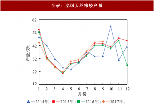 泰国天然橡胶产量增长十分显著。从2017年 5月以来,泰国天然橡胶产量同比增长率均在6%以上。2017年8月泰国天然橡胶产量超过45万t。