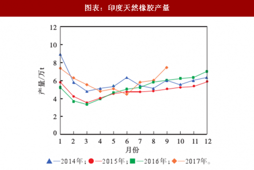从2013年开始,由于胶价过低,胶农割胶积极性下降,印度天然橡胶产量持续下降,年产量从2013年的91. 9万t降至2015年的57. 5万t,降幅达到37%。不过2016年之后印度天然橡胶产量明显提高。2017年,除了6月天然橡胶产量同比减小10%以外,其余月份印度天然橡胶产量均保持了9%以上的增长率,9月的天然橡胶同比增长率高达25%,产量逼近历史高位水平。2017年1- 9月,印度天然橡胶累计产量为52. 5万t,同比增 长23%。
