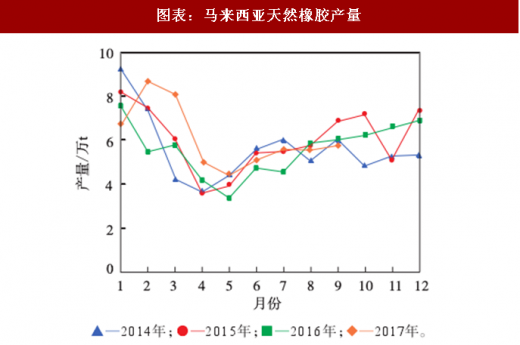印度尼西亚天然橡胶产量增速相对平缓。2017年4—8月印度尼西亚天然橡胶产量同比下降,降幅为2%~4%。2017年1—9月,印度尼西亚天然橡胶累计产量为246. 6万t,同比增长2%。