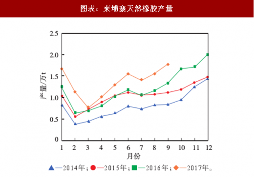 柬埔寨天然橡胶产量虽然基数低,但是增速较高。2017年1-9月,柬埔寨天然橡胶产量同比增长率大多保持在20%以上(3月的增速为6%)。柬埔寨的天然橡胶产量潜力非常大,未来值得关注。