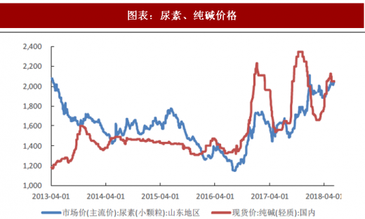 维生素系列价格企稳,b1 价格小幅下跌。2018 年 6 月 7 日,维生素 a、维生素 e、 维生素 b1 的价格分别为 540 元/吨、维生素 e 价格分别为 38.5 元/吨,维生素 b1 价格分别为 262.5 元/吨,维生素系列价格企稳,维生素 b1 价格本周继续小 幅下跌。尿素价格上涨、纯碱价格稳定。2018 年 6 月 7 日尿素价格为 2045 元/吨,较上周上涨。2018 年 6 月7日山东地区纯碱价格为 2050 元/吨,与上周持平。