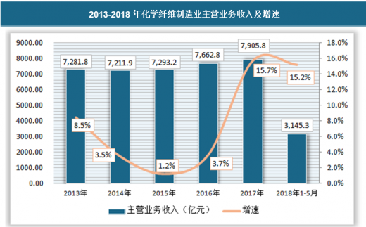 2017年我国化学纤维制造行业主营业务收入为7905.8亿元,相对于2016年增长了243亿元。2018年1-5月,我国化学纤维制造行业主营业务收入为3145.3亿元,同比增长了15.7%。